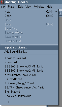 *M&L tutorial music plays* Okay, I'm only gonna say this once so I don't derail this thread, but this could come in handy for anyone looking to spice up midis or modules with other insturments here anyhow, so listen up! In the File menu of Modplug Tracker, there are two options that fit what I believe you will want. Import Midi Library and Add Sound Bank. Other module programs may also support these options. These will let you import SF2, DLS, Ultrasnd.ini, and txt files. I have no idea what sets use txt files. Importing as a Midi Library will replace Modplug's default insturment set with what is in the sound bank file. If you want to open up a midi with what you have here with ease, use this. Be aware though, you'll have to find the old sound bank if it doesn't turn out well. I believe Windows comes with GM.dls at least. Doing that should bring up a warning stating if you want to add or replace. Select NO to replace all the original insturments. If you simply want another set of insturments you can use in your songs, or replace existing insturments with, simply select Add Sound Bank. You now have another folder on the left side of the screen to select insturments from.
